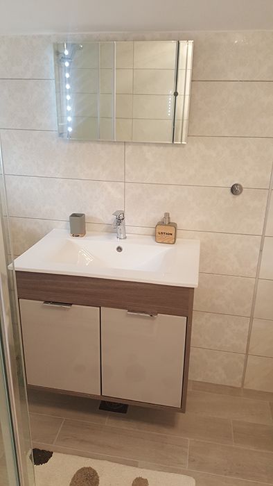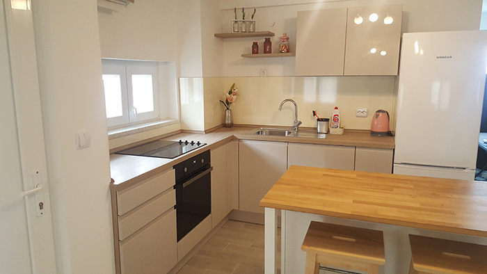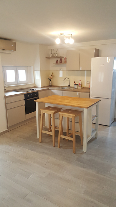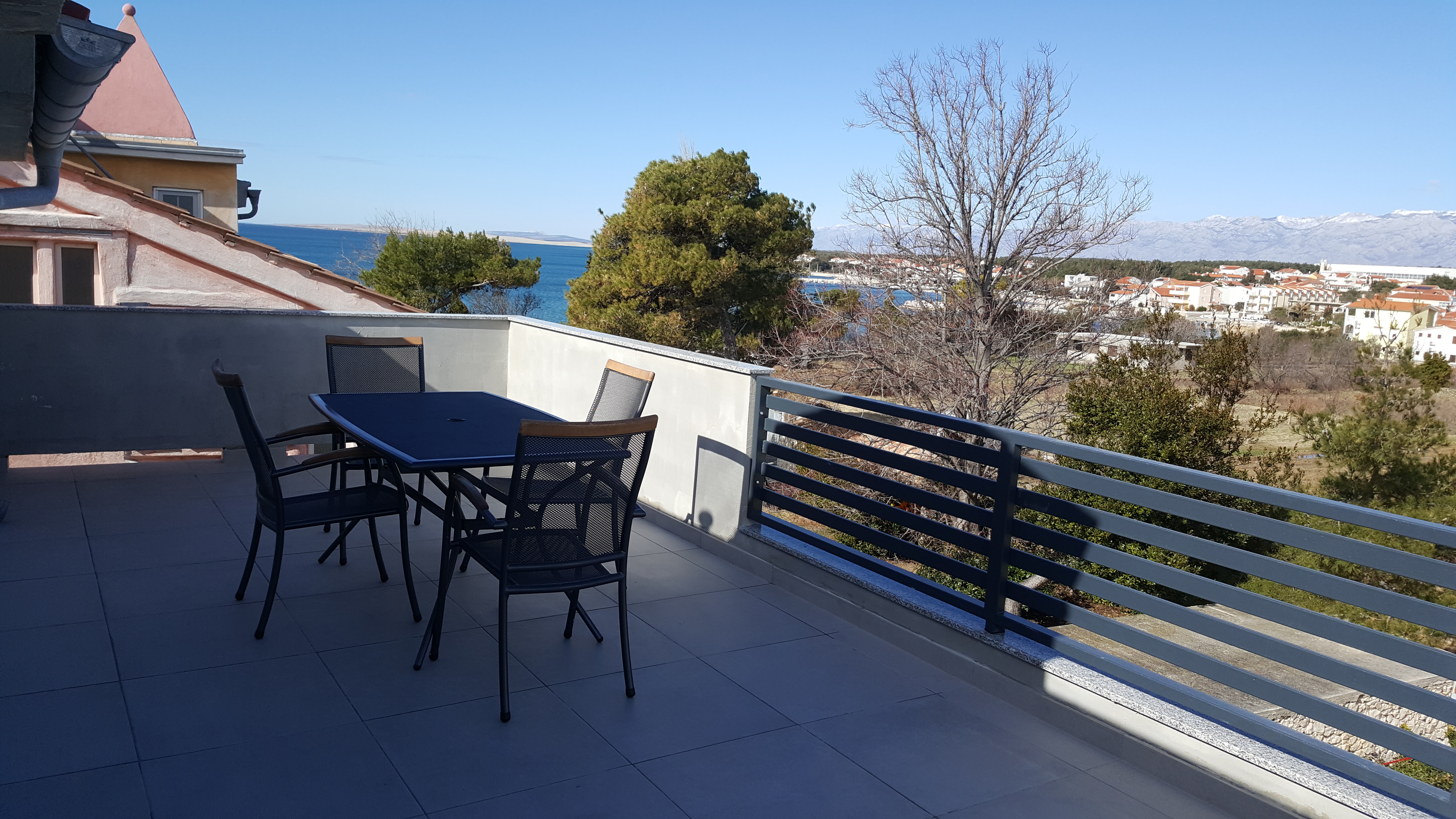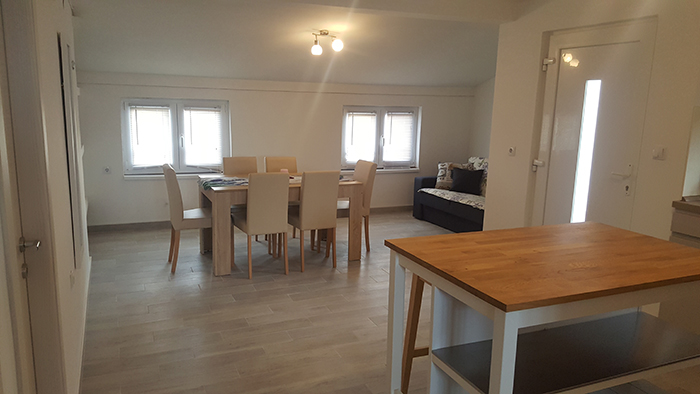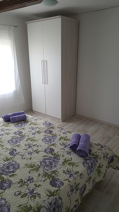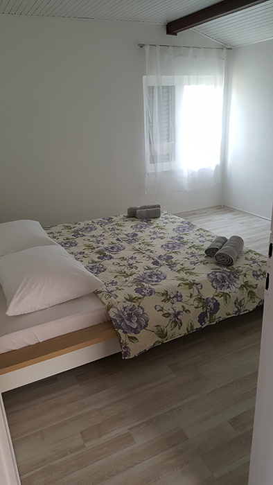 2–sobni apartman (za 4 odrasle osobe i troje djece) je smješten u potkrovlju kuće. Svaka soba ima bračni krevet. U jednoj sobi se, po potrebi, može staviti pomoćni ležaj. U dnevnom boravku je kauč na rasklapanje kao pomoćni ležaj. Imamo dječji putni krevetić i po potrebi ga stavljamo u sobe. Kuhinja i dnevni boravak su u istoj prostoriji. U kuhinji je štednjak s 4 el. kola s pećnicom, frižider/zamrzivač. Opremljena je svim posuđem, kuhinjskim priborom i aparatima (aparat za kavu, kuhalo za vodu). Kupaona ima veliku tuš kadu. Apartman ima veliku terasu s garniturom za sjedenje s pogledom na more, WiFi pristup i klima uređaj. Također ima i mali balkon na koji se dolazi iz jedne sobe. Parking je osiguran u dvorištu kuće. Na korištenje imate i mali roštilj. Osigurana je čista posteljina, ručnici za tuširanje i kuhinjske krpe.